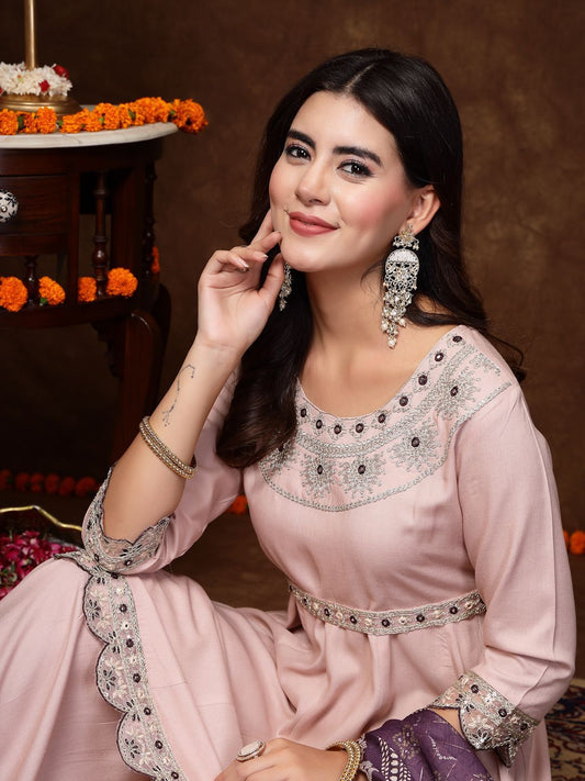Rose Gold & Purple Ethnic Motifs Embroidered Anarkali Kurta & Sharara With Dupatta