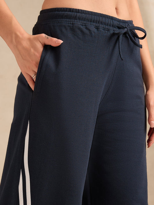 Navy Blue Contrast Striped Wide Leg Sweatpants