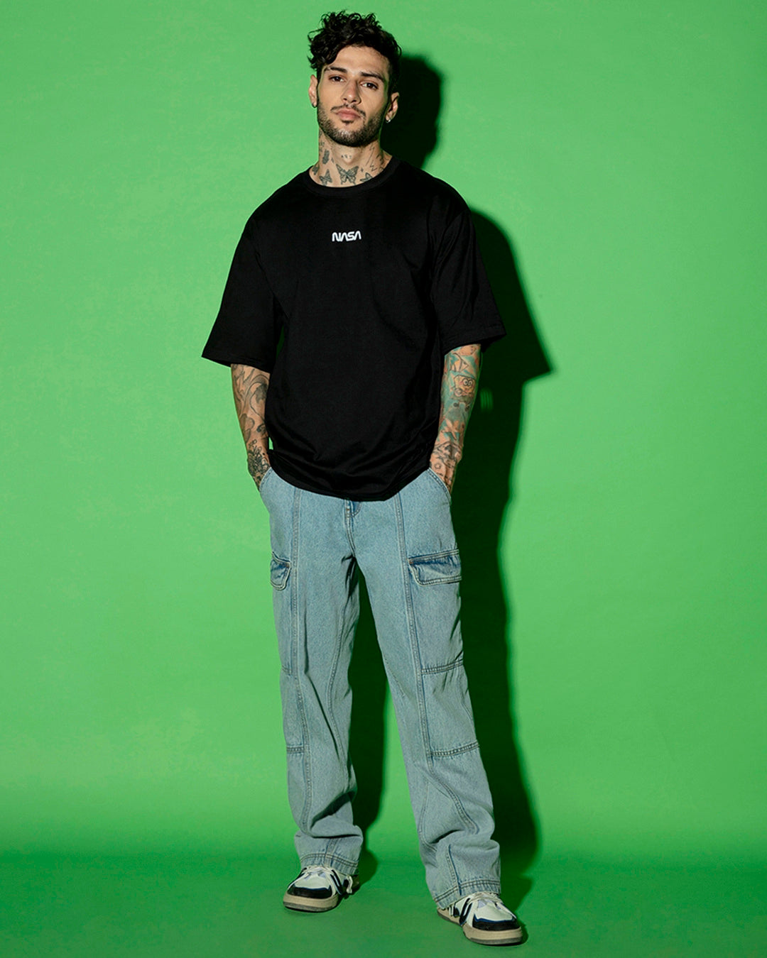 Men's Black Universal Astro Graphic Printed Oversized T-shirt