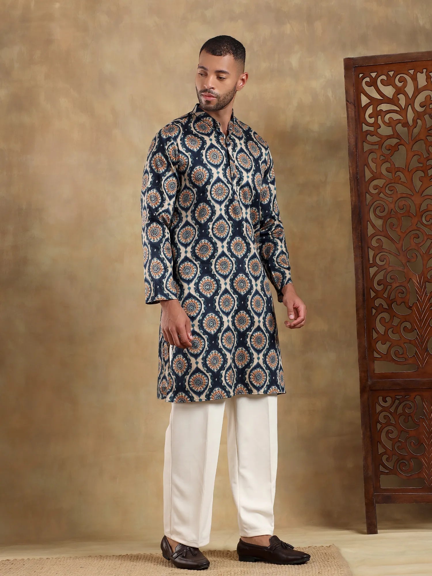Off White - Navy Printed Long Kurta