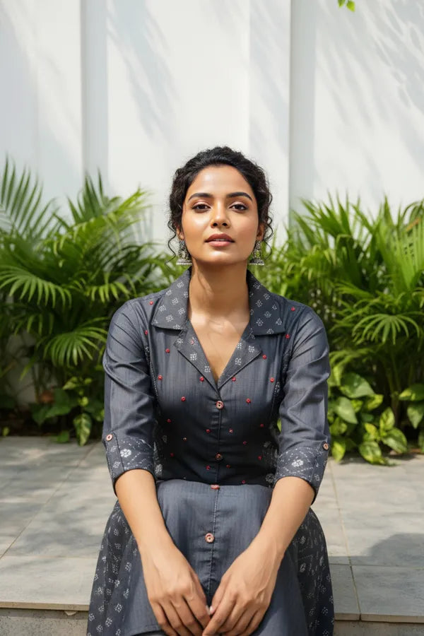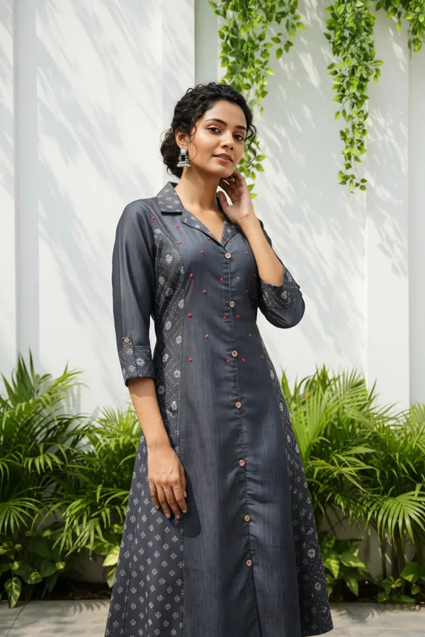 Exclusive Denim Black A Line Indo Western Dress With Coat Collar