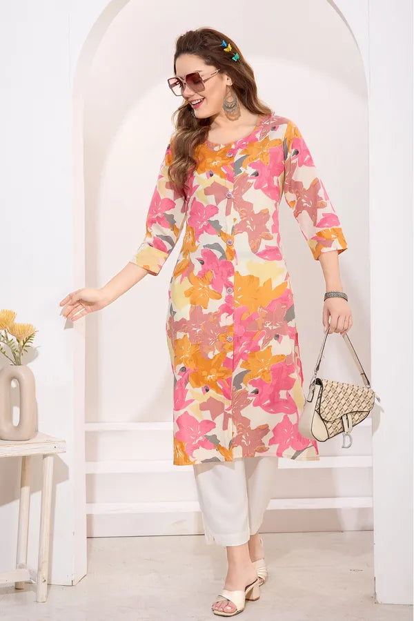 Pink Orange Linen Cotton Round Neck Women Long Kurta