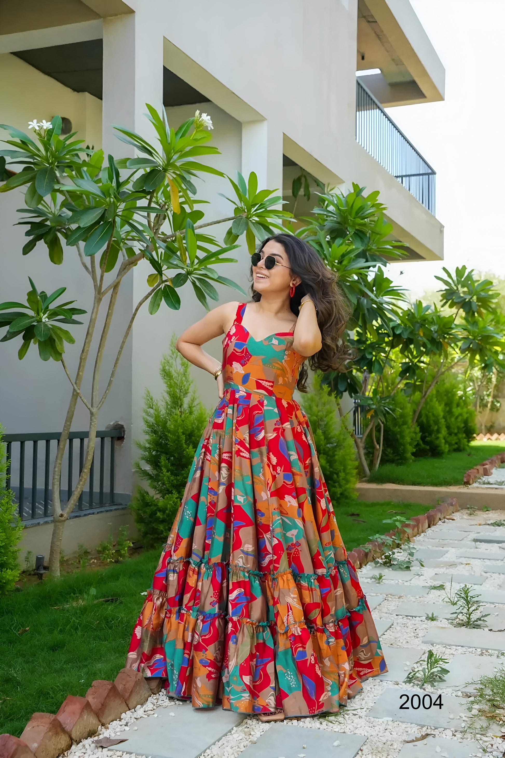 Red Multicoloured Floral Printed Flared Rayon Long Dress