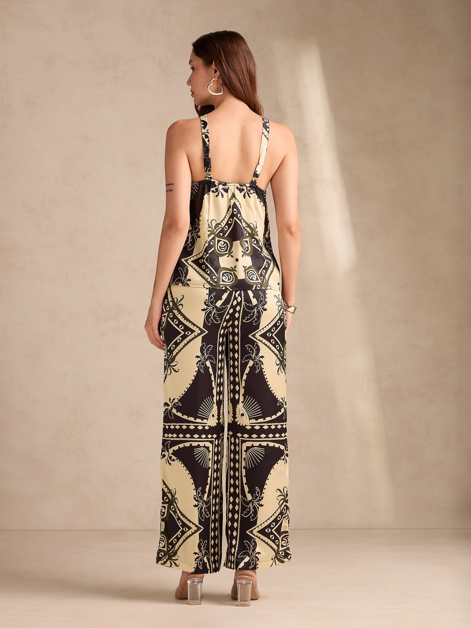 Black Scarf Print Coord Set With Halter Neck Assymentric Top Paired With Straight Fit Trousers