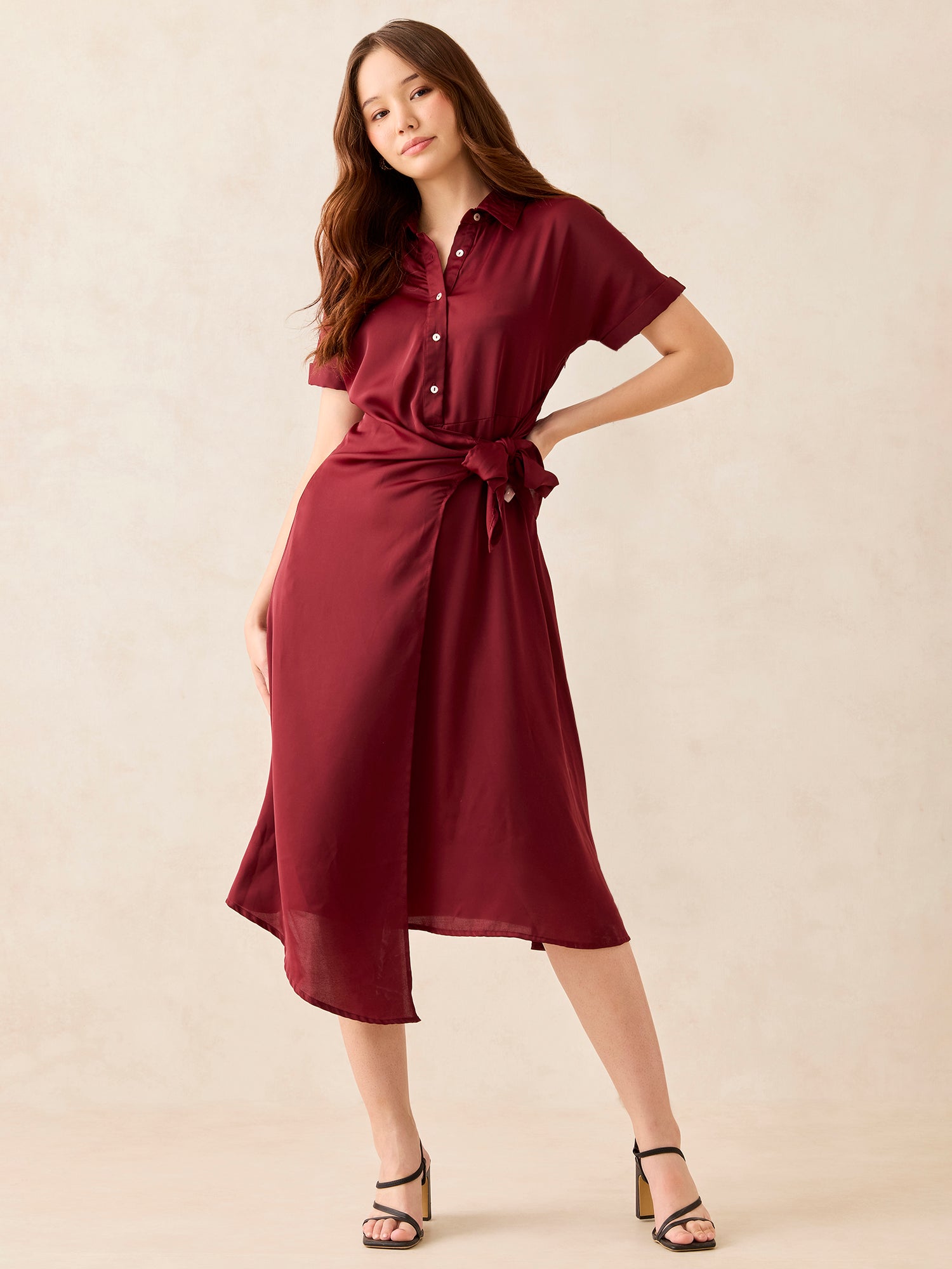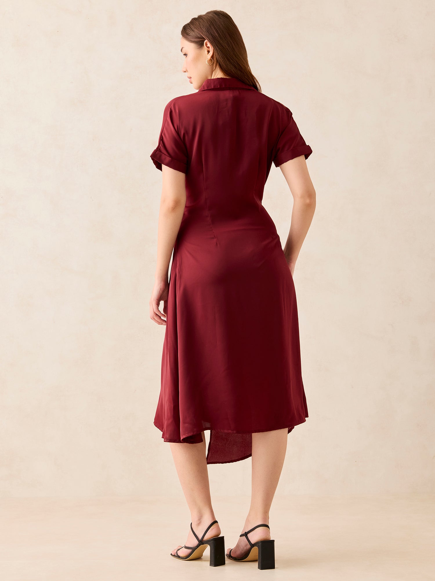 Maroon Midi Tie Up Detail Shirt Dress