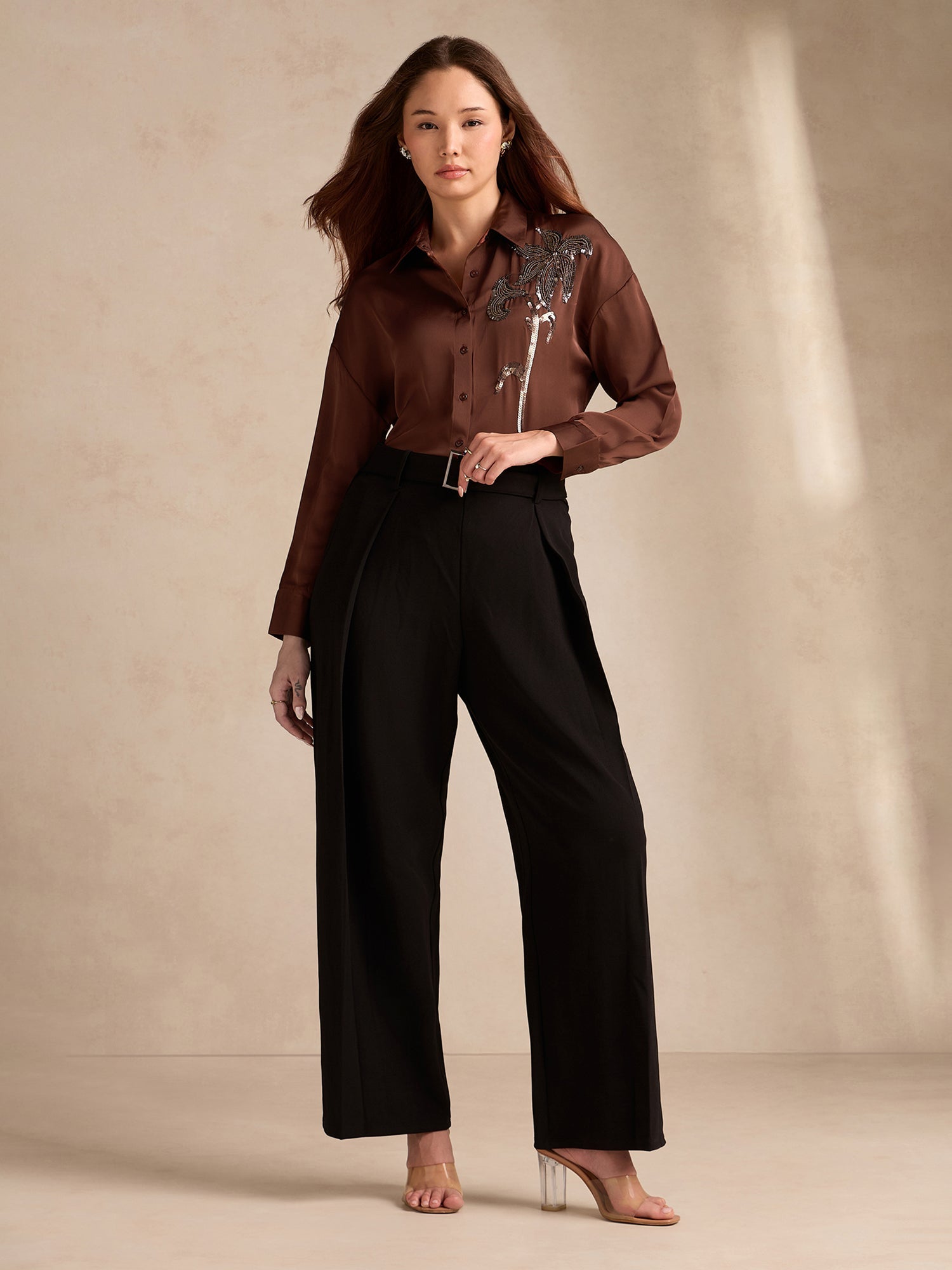 Brown Oversized Embroidered Satin Shirt